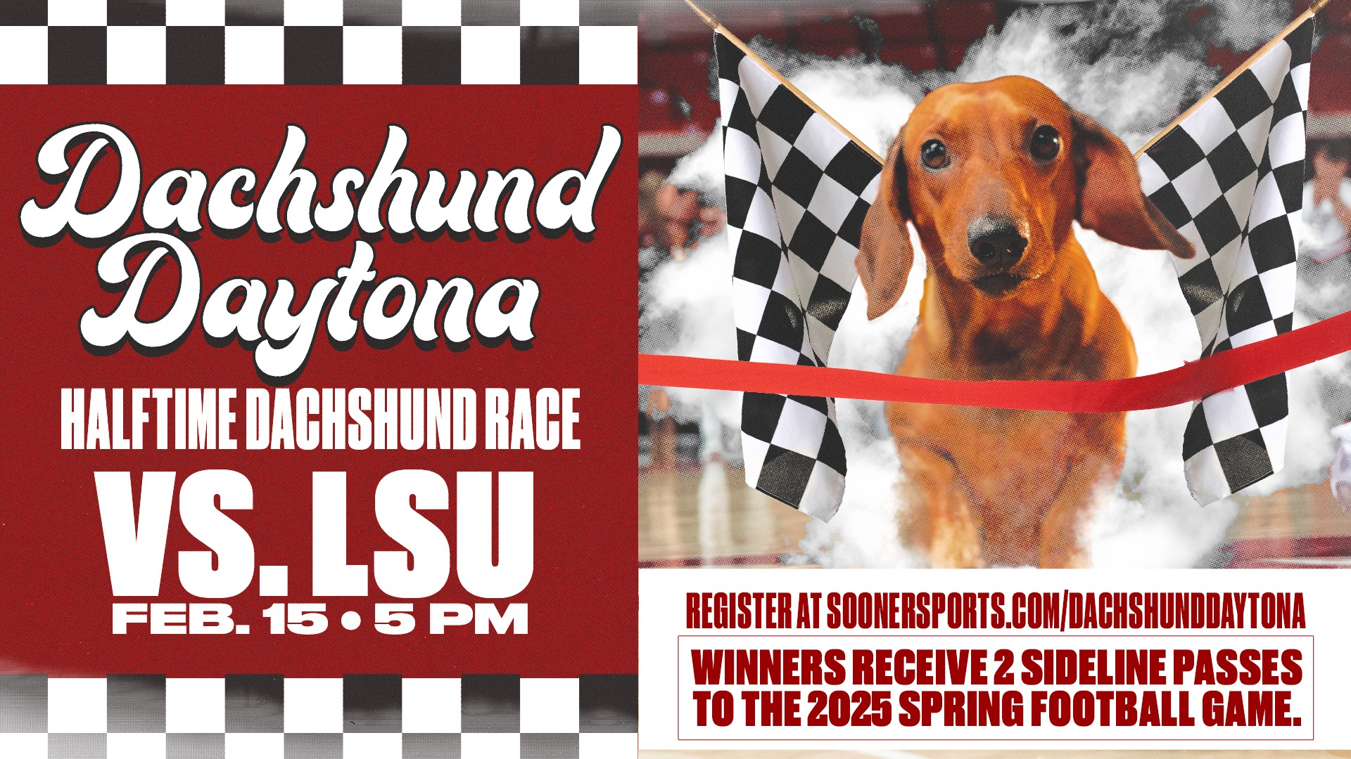 Register your Dachshund for the chace to participate in the inaugural halftime Dachshund Daytona race at the OU men's basketball game on Saturday, February 15 at the Lloyd Noble Center vs. the LSU Tigers at 5:00 pm. All dachshund chosen to participate in the race must have two handlers and all waiver forms filled out prior to the competition. Halftime race participants will be sent further information the week of the game with entry points, holding areas, and venue rules.